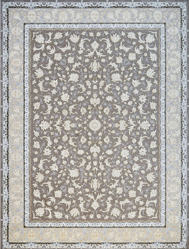 فرش کلکسیون برلیان با کد 12825 به رنگ نقرهای، بافته شده با 1200 شانه و تراکم 3600، از جنس نخ 100% آکریلیک برای زیبایی و دوام بیشتر طراحی شده است.