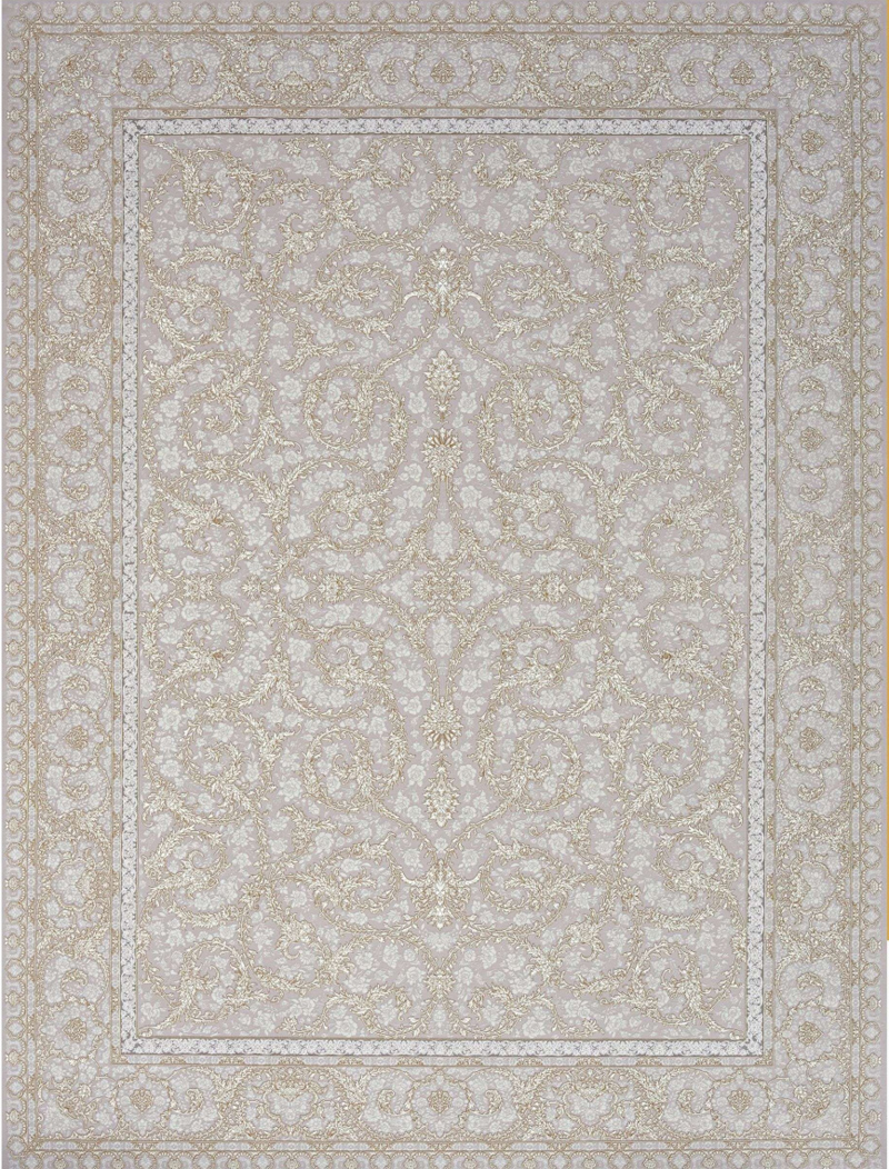 فرش نقرهای کد 12857 از کلکسیون برلیان با 1200 شانه و تراکم 3600، از جنس نخ 100% آکریلیک بافته شده است.