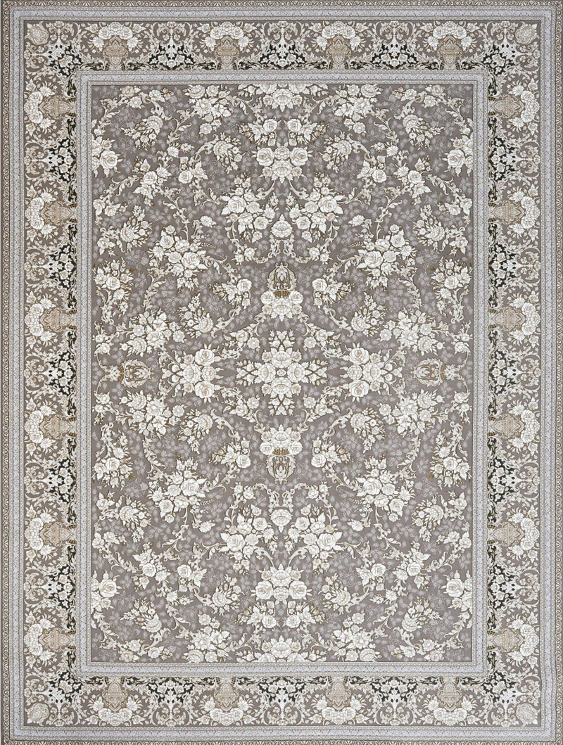فرش برلیان کد 13814 با رنگ طوسی، 1200 شانه و تراکم 3600، از جنس نخ 100% آکریلیک تهیه شده است.