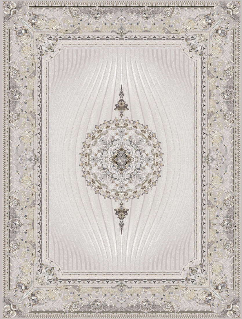 فرش مدل 82079 از کلکسیون برلیان با رنگ نقره‌ای، دارای 1200 شانه و تراکم 3600 بافته شده و از نخ 100% آکریلیک تهیه شده است.