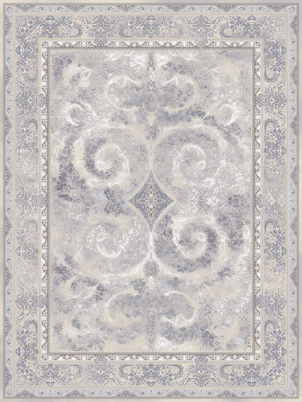 فرش کرم رنگ کلکسیون دایان با کد 85086، 1200 شانه و تراکم 3600 از جنس نخ 100% آکریلیک است.