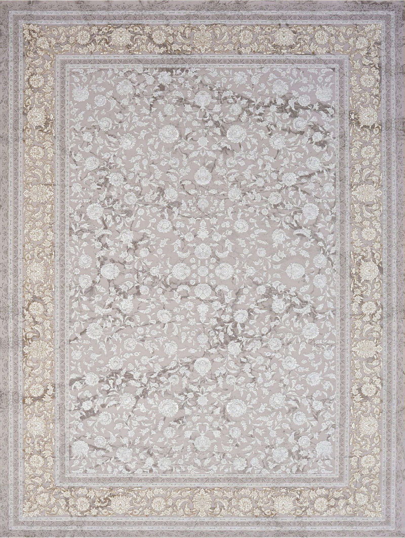 فرش کد 12571 از کلکسیون ویوات با رنگ نقرهای، در 1200 شانه و تراکم 3600 تولید شده و از جنس نخ 100% آکریلیک است.