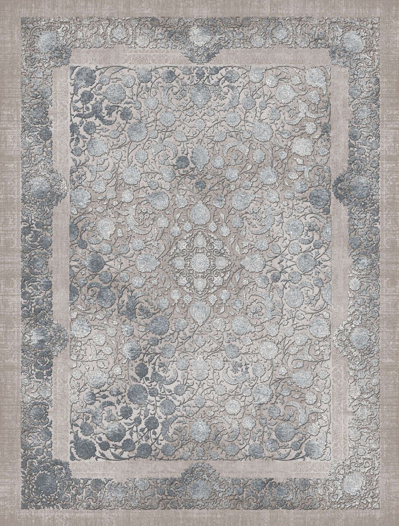 فرش نقرهای از کلکسیون ویوات با کد 32001 دارای بافت 1200 شانه و تراکم 3600 بوده و از نخ 100% آکریلیک تهیه شده است.