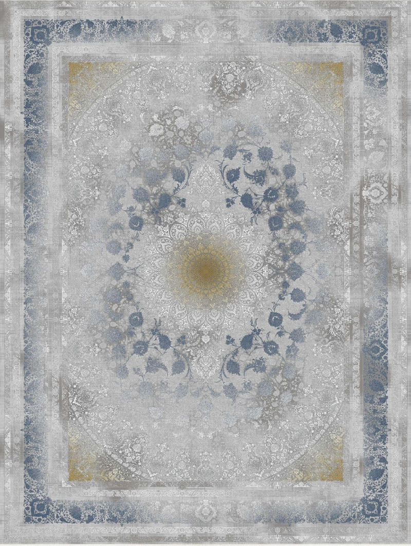 فرش کد 32043 از کلکسیون ویوات به رنگ نقره‌ای، با 1200 شانه و تراکم 3600، از نخ 100% آکریلیک بافته شده است.