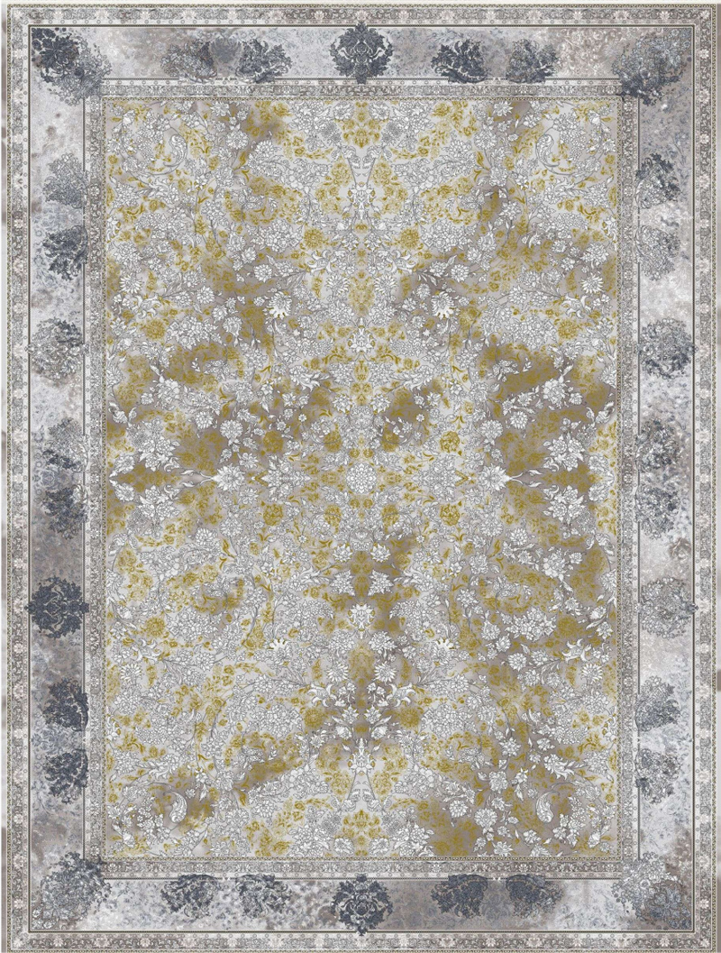 فرش کد 32045 از کلکسیون ویوات با رنگ نقرهای و بافته شده در 1200 شانه و تراکم 3600، از 100% نخ آکریلیک ساخته شده است.